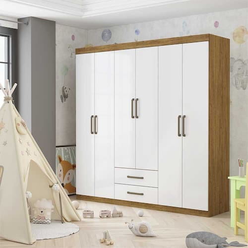 Guarda-Roupa Elissa A22 é um produto perfeito para quem possui um ambiente com espaço reduzido e ainda procura qualidade e durabilidade no mesmo móveis. Possui 1,87m de altura, 1,53m de largura e 0,40m de profundidade combinado com 6 portas, 2 gavetas, 2 prateleiras e um grande cabideiro, deixando o produto com uma ótima divisão interna. O maleiro é ideal para guardar malas, cobertores, edredons. O cabideiro além de resistente, é ideal para pendurar pares de blusas, camisas acessórios. As prateleiras são perfeitas para colocar roupas como blusas, shorts, regatas, kits de maquiagem, toalhas, caixinhas com acessórios e bolsas menores. As gavetas fixadas sobre corrediças metálicas, são ideais para guardas blusas dobradas, shorts, malhas e roupas íntimas. Estrutura do produto em mdp. Indicado tbm para ambientes infantis, como quartos e brinquedoteca.