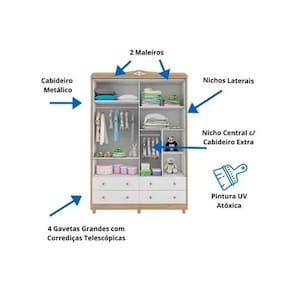 CARACTERÍSTICAS DE MÓVEIS Tipo de Estrutura do Móvel - 100% MDF Tipo de Pintura - UV Tipo de Acabamento da Pintura - Semi Brilho Tipo de puxador - ABS/PVC Quantidade de Prateleiras - 5 Prateleiras Quantidade de Gavetas - 4 Gavetas Diferenciais da Gaveta - c/ Corrediças Telescópicas Quantidade de Portas - 4 Portas de Abrir Garantia - 3 meses