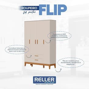 O Guarda-Roupa Infantil Flip 4 Portas e 2 Gavetas é produzido em MDF com pintura UV atóxica, garantindo segurança e durabilidade. Possui 4 portas com dobradiças metálicas, 2 gavetas com corrediças telescópicas, cabideiro em alumínio e prateleiras internas que facilitam a organização. Os puxadores em MDF revestidos agregam charme ao design, enquanto os pés de madeira proporcionam resistência e estabilidade.