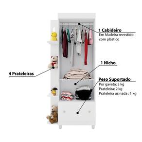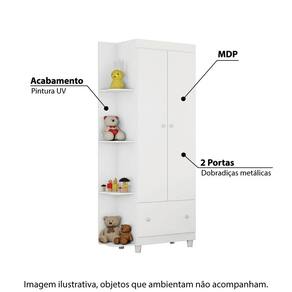 A Guarda Roupa Infantil Gutti conta com design encantador! São 1 gaveta com corrediças metálicas, 2 portas, 1 cabideiro, 4 prateleiras externas e 1 nicho interno com muito espaço para guardar roupas e objetos. É muito encantamento para ambientar o quarto do pequeno do início da sua infância. Seu diferencial é a montagem flex, com 3 opções de cores ( branco/ branco e rosa/ branco e azul). Produzido em MDP, garantindo maior durabilidade ao produto.