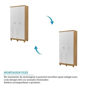 O Guarda-Roupa Infantil Júnior 3 Portas e 3 Gavetas é uma excelente escolha para quem busca organização e praticidade no quarto das crianças. Fabricado em MDF com pintura UV atóxica, conta com 3 portas com dobradiças metálicas, cabideiro e prateleira interna para facilitar o dia a dia. As 3 gavetas possuem corrediças telescópicas e suportam até 4kg cada, garantindo resistência e funcionalidade. Os puxadores em plástico e os pés firmes complementam o móvel, que ainda acompanha duas opções de rodapés um usinado (torneado) e outro reto para você escolher o estilo que mais combina com o ambiente.