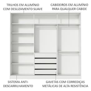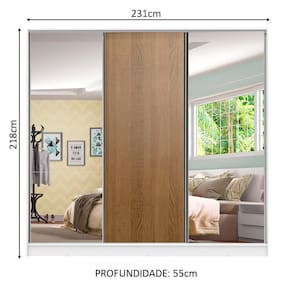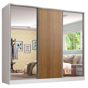 - Itens inclusos: Três (3) cabideiros | Quatro (4) gavetas internas | Oito (8) prateleiras | Três (3) portas de correr, com sistema anti-descarrilhamento, sendo uma (1) de madeira e duas (2) com espelhos