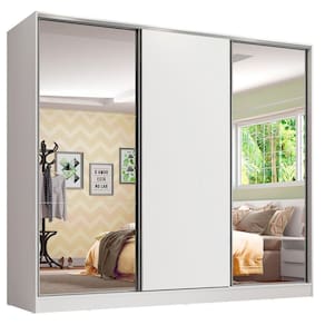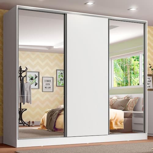 - Itens inclusos: Três (3) cabideiros | Quatro (4) gavetas internas | Oito (8) prateleiras | Três (3) portas de correr, com sistema anti-descarrilhamento, sendo uma (1) de madeira e duas (2) com espelhos