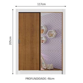 Medidas totais do guarda-roupa: 205 cm de altura x 117 cm de largura x 46 cm de profundidade.
