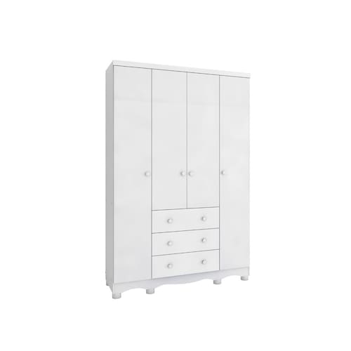 O Armário Júnior New 4 Portas é um produto 100% MDF e possui pintura atóxica. Sua estrutura é fabricada em chapa de 12 mm e seus pés são injetados em plástico de alta resistência. Os puxadores são também em plástico. Os cabideiros são metálicos e suas gavetas possuem corrediças apoiadas metálicas. Acompanha dois modelos de rodapés que podem ser definidos no momento da montagem.
