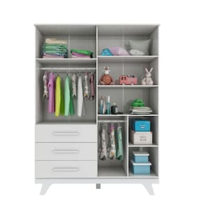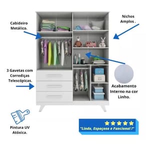 Guarda Roupa Infantil Retrô Peroba 4 Portas Cor Branco, referencia P3374.1 com portas com PETG cristal, puxadores em MDF revestido, cabideiro metálico, pés em ABS, corrediças telescópicas, linho interno, 100% MDF e com sistema antitombamento. Com um design clássico e atemporal é a escolha perfeita para quem busca estilo e praticidade. Possui um acabamento de portas com PETG cristal na cor branca, que combina com qualquer decoração. Seu estilo retrô traz um toque de nostalgia, enquanto as quatro portas oferecem amplo espaço para organizar roupas, brinquedos e acessórios. Ideal para manter o ambiente sempre organizado e agradável. Além de sua estética encantadora, foi projetado para atender às necessidades dos pequenos e facilitar a vida dos pais. Com espaço suficiente para armazenar tudo o que seu filho precisa, ele ajuda a manter o quarto arrumado e livre de bagunça. A durabilidade do MDF garante que o móvel acompanhará o crescimento da criança, tornando-se um investimento a longo prazo.
