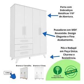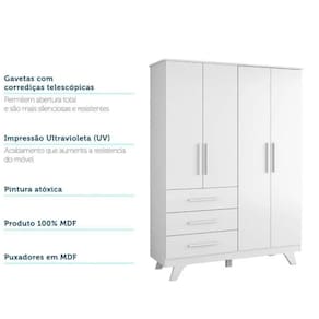 Guarda Roupa Infantil Retrô Peroba 4 Portas Lisa Cor Branco, referencia P3223 com puxadores em MDF revestido, cabideiro metálico, pés em ABS, corrediças telescópicas, linho interno, 100% MDF e com sistema antitombamento.Com um design clássico e atemporal é a escolha perfeita para quem busca estilo e praticidade. Possui um acabamento liso na cor branca, que combina com qualquer decoração. Seu estilo retrô traz um toque de nostalgia, enquanto as quatro portas oferecem amplo espaço para organizar roupas, brinquedos e acessórios. Ideal para manter o ambiente sempre organizado e agradável. Além de sua estética encantadora, foi projetado para atender às necessidades dos pequenos e facilitar a vida dos pais. Com espaço suficiente para armazenar tudo o que seu filho precisa, ele ajuda a manter o quarto arrumado e livre de bagunça. A durabilidade do MDF garante que o móvel acompanhará o crescimento da criança, tornando-se um investimento a longo prazo.