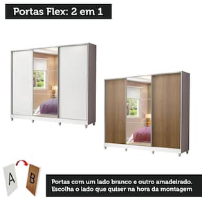 Os tubos cabideiros são em alumínio, muito resistentes e a profundidade do móvel é ideal para qualquer tamanho de cabide. Além disso, o fechamento com duas portas de correr de madeira e uma com espelhos amplia o ambiente e proporciona um ganho de espaço enorme, sem prejudicar a circulação no quarto.