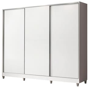 - Itens inclusos: Três cabideiros | Quatro gavetas internas | Oito prateleiras | Três portas de correr com sistema anti-descarrilhamento