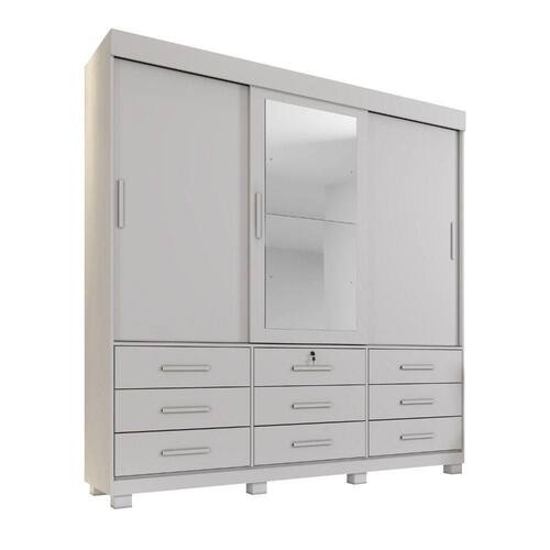 Guarda Roupa Londres 3 Portas 9 Gavetas 4 Prateleiras Branco O Guarda-Roupa Londres e produzido em chapa 15 mm, com 3 portas de correr 1 com espelho e possui trilho aluminio ante queda que garante durabilidade e modernidade, contem 4 prateleiras e 9 gavetas com corredicas telescopicas sendo 1 com chave que proporciona suavidade e melhor durabilidade, com cabideiro e trilho em aluminio moderno e muito util. Sua fabricacao utiliza a linha mdp perffect, que une a sustentabilidade a inovacao tecnologica, proporcionando durabilidade e facil limpeza; inspirando sofisticacao ao mobiliario. Sua pintura UV conta com boa resistencia, e facil de limpar e e ecologicamente correto, pois utiliza madeira de reflorestamento, evitando o desmatamento. Caracteristicas: Material principal: MDP Espessura da chapa: 15 mm Escala de brilho: semibrilho Sistema de montagem: parafuso, cavilha e cantoneiras metalicas