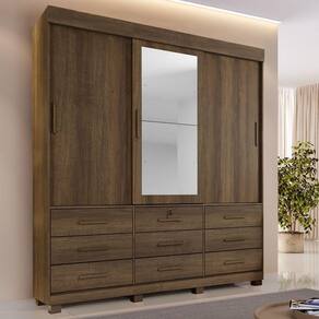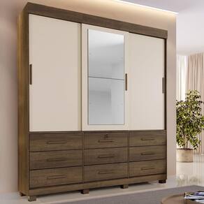Guarda Roupa Londres 3 Portas 9 Gavetas 4 Prateleiras Imbuia-imbia Off Flex O Guarda-Roupa Londres e produzido em chapa 15 mm, com 3 portas de correr 1 com espelho e possui trilho aluminio ante queda que garante durabilidade e modernidade, contem 4 prateleiras e 9 gavetas com corredicas telescopicas sendo 1 com chave que proporciona suavidade e melhor durabilidade, com cabideiro e trilho em aluminio moderno e muito util. Sua fabricacao utiliza a linha mdp perffect, que une a sustentabilidade a inovacao tecnologica, proporcionando durabilidade e facil limpeza; inspirando sofisticacao ao mobiliario. Sua pintura UV conta com boa resistencia, e facil de limpar e e ecologicamente correto, pois utiliza madeira de reflorestamento, evitando o desmatamento. Caracteristicas: Material principal: MDP Espessura da chapa: 15 mm Escala de brilho: semibrilho Sistema de montagem: parafuso, cavilha e cantoneiras metalicas