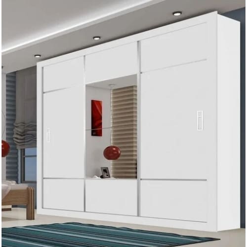 Especificações - medidas produto montado: 218 (a) x 216 (l) x 52 (c) cm; - material: mdp; - acabamento: pintura uv; - possui porta: 3; - tipo de porta: correr; - possui prateleiras: 6 internas; - possui gavetas: 4; - corrediças: metálicas; - possui cabideiro: sim 2;