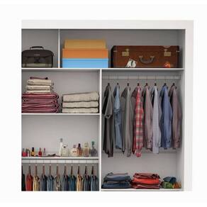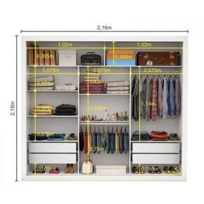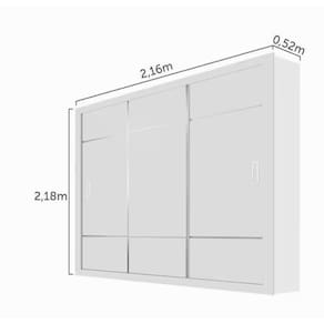 Especificações - medidas produto montado: 218 (a) x 216 (l) x 52 (c) cm; - material: mdp; - acabamento: pintura uv; - possui porta: 3; - tipo de porta: correr; - possui prateleiras: 6 internas; - possui gavetas: 4; - corrediças: metálicas; - possui cabideiro: sim 2;
