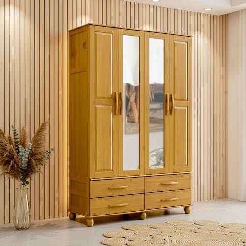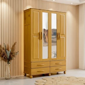 Este roupeiro de pinus com 4 portas e 4 gavetas é a escolha certa para quem valoriza qualidade, resistência e um design encantador. Produzido em madeira de pinus, transmite rusticidade e elegância, trazendo a beleza natural da madeira para dentro do quarto. Seus detalhes no tampo, na base e nos pés completam a harmonia do móvel, criando uma peça imponente e, ao mesmo tempo, acolhedora. As gavetas são amplas, perfeitas para manter roupas e objetos organizados com praticidade, enquanto os puxadores em madeira maciça reforçam sua autenticidade. Com um design que equilibra charme rústico e sofisticação, o roupeiro ainda conta com duas portas de vidro que acrescentam delicadeza e leveza ao conjunto. Mais do que funcional, ele é um móvel que transforma o ambiente. Acabamento da Prateleira: Pintura UV Escala de Brilho da Prateleira: Semi-Fosco Possui Cabideiros: Sim Acabamento da Gaveta: Pintura UV Escala de Brilho da Gaveta: Semi-Brilho Material do Puxador da Gaveta: Madeira Maciça Possui Organizador de Gaveta: Não Acabamento da Porta: Pintura UV Escala de Brilho da Porta: Semi-Brilho Material do Puxador da Porta: Madeira Maciça Acabamento dos Pés: Pintura Altura do Espelho: 153 cm Altura dos Pés: 10 cm Altura Máxima dos Pés: 10.0000 Ambiente Principal: Quarto codigo_ean: 7900288252463 Complexidade da Montagem: Alta: deve ser montado por um montador especializado Cor: Nogueira Cor do Produto: Nogueira Cor Interna: Nogueira Escala de Brilho: Semi-Brilho Espessura da Estrutura (mm): 17 mm Espessura das Portas (mm): 17 mm Espessura das Prateleiras (mm): 15 mm Espessura do Espelho: 2 mm Espessura do Fundo (mm): 3 mm Espessura do Fundo das Gavetas (mm): 3 mm Formato do Espelho: Retangular Gaveta com Chave: Não Itens Inclusos: 1 Guarda-Roupa, Kit Ferragens e Manual de Montagem Largura do Espelho: 23,5 cm Linha ou Coleção: Pollux Manual de Montagem e Instalação: https://product-hub-prd.madeiramadeira.com.br/175312513/documents/f610c3f0-c4f8-4adc-81cb-d2e3147bbcee3235549543917588021653676.pdf Marca: Móveis Serpil Material da Gaveta: MDF Material da Porta: Madeira Maciça Material da Prateleira: MDP Material dos Pés: Madeira Maciça Material Principal: Madeira Maciça modular: Não Necessita Montagem: Sim Nicho com Cabideiro: Não Origem do Produto: Nacional Peso: 104 kg Peso Máximo por Gaveta: 4 kg Peso Máximo por Prateleira: 10 kg Porta Janelada: Não Possui Calceiros: Não Possui Capelinha: Não Possui Espelho: Sim Possui Espelho Interno: Não Possui Ganchos: Não Possui iluminação: Não Possui Nichos: Não Possui Painel de TV: Não Possui Penteadeira: Não Possui Pés: 06 Possui Portas: Sim Possui Prateleiras: Sim Possui Sapateira: Não Produto Montado: Sim Quantidade de Cabideiros: 01 Cabideiro Quantidade de Espelho: 02 Espelhos com Tamanhos Iguais Quantidade de Gavetas: 04 Gavetas Quantidade de Portas com Espelhos: 2 Portas com Espelho Quantidade de Prateleiras: 04 Prateleiras Recomendações de Uso, Manutenção e Limpeza: Use um pano macio levemente umedecido. Não utilizar produtos abrasivos. Sapatas Niveladoras: Não Sistema de Montagem: Parafusos, Cavilhas Tipo de Corrediça da Gaveta: Metálica Simples Tipo de Dobradiça/Corrediça da Porta: Metálica Tipo de Fixação do Espelho: Fita Dupla Face Tipo de Gaveta: Externa Tipo de Guarda-Roupa: Casal Tipo de Madeira Maciça: Pinus Tipo de Madeira Maciça da Porta: Pinus Tipo de Madeira Maciça dos Pés: Pinus Tipo de Puxador da Gaveta: Externo Tipo de Puxador da Porta: Externo