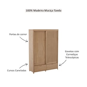 Características: Estrutura em Madeira Maciça de Pinus Taeda de Reflorestamento Pintura semi-brilho 02 Portas de correr 02 Gavetas com corrediças telescópicas Puxadores cava Curvas caneladas Cabideiros de alumínio Amplo espaço para armazenamento Peso máximo suportado pelas Prateleiras 10kg distribuídos Peso máximo suportado pelas Gavetas 05kg distribuídos