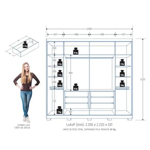 Roupeiro Platinium MDF 6P 6G - Praticidade e Elegância para Seu Quarto! O Roupeiro Platinium MDF 6P 6G é 100% em MDF, oferecendo alta durabilidade e resistência. Com 6 portas equipadas com dobradiças metálicas, garante fácil acesso e fechamento suave. Suas 6 gavetas com corrediças telescópicas proporcionam organização prática e eficiente. O roupeiro conta com 7 prateleiras, 2 calceiros metálicos, 2 cabideiros metálicos e maleiro, garantindo amplo espaço para todos os seus itens. Os puxadores de MDF e os 10 pés de plástico conferem um design moderno e elegante. Com acabamento interno igual ao externo, ele combina beleza e funcionalidade para o seu ambiente. Acabamento da Prateleira: Pintura Texturizada UV Escala de Brilho da Prateleira: Fosco Acabamento da Gaveta: Pintura Texturizada UV Escala de Brilho da Gaveta: Fosco Possui Organizador de Gaveta: Não Acabamento da Porta: Pintura Texturizada UV Escala de Brilho da Porta: Fosco Material do Puxador da Porta: MDF Altura dos Pés: 5 cm Ambiente Principal: Quarto codigo_ean: 7900288204202 Complexidade da Montagem: Alta: deve ser montado por um montador especializado Cor: Cinamomo / Areia Cor do Produto: Cinamomo / Areia Cor Interna: Cinamomo Escala de Brilho: Fosco Espessura da Estrutura (mm): 12 mm Espessura das Portas (mm): 15 mm Espessura das Prateleiras (mm): 12 mm Espessura do Fundo (mm): 3 mm Espessura do Fundo das Gavetas (mm): 3 mm Gaveta com Chave: Não Guarda-Roupa Suporta Até (kg): 67 kg Informações Complementares: Fabricado com painéis de madeira reflorestada e certificada. Roupeiro 100% MDF Itens Inclusos: 1 Guarda-Roupa, Kit Ferragens e Manual de Montagem Linha ou Coleção: Platinium Manual de Montagem e Instalação: https://product-hub-prd.madeiramadeira.com.br/565216547/documents/f410fd0e-0b4a-493c-9cff-ada8d2a613e83092166573817532992243608.pdf Marca: Zanzini Material da Gaveta: MDF Material da Porta: MDF Material da Prateleira: MDF Material dos Pés: Plástico Material Principal: MDF modular: Não Montagem Flex: Não Necessita Montagem: Sim Nicho com Cabideiro: Não Origem do Produto: Nacional Peso: 183 kg Peso Máximo por Gaveta: 3 kg Peso Máximo por Prateleira: 5 kg Porta Janelada: Não Possui Calceiros: 02 Possui Capelinha: Não Possui Espaço para Vestidos Longos: Não Possui Espelho: Não Possui Espelho Interno: Não Possui Ganchos: Não Possui iluminação: Não Possui Nichos: Não Possui Painel de TV: Não Possui Penteadeira: Não Possui Pés: 10 Possui Portas: Sim Possui Prateleiras: Sim Possui Sapateira: Não Produto Montado: Sim Quantidade de Cabideiros: 02 Cabideiros Quantidade de Gavetas: 06 Gavetas Quantidade de Prateleiras: 07 Prateleiras Recomendações de Uso, Manutenção e Limpeza: Limpar com flanela ou pano macio seco, não utilizar produtos abrasivos, desengordurantes, álcool ou qualquer outro produto químico. Não expor o produto diretamente à luz solar e à umidade Sapatas Niveladoras: Não Sistema de Montagem: Parafusos auto atarraxantes, cola, cavilhas, pregos Tipo de Corrediça da Gaveta: Metálica Telescópica Tipo de Dobradiça/Corrediça da Porta: Metálica Tipo de Gaveta: Interna Tipo de Guarda-Roupa: Casal Tipo de Puxador da Gaveta: Não Possui Tipo de Puxador da Porta: Externo
