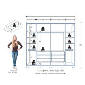 Roupeiro Platinium MDF 6P 6G - Praticidade e Elegância para Seu Quarto! O Roupeiro Platinium MDF 6P 6G é 100% em MDF, oferecendo alta durabilidade e resistência. Com 6 portas equipadas com dobradiças metálicas, garante fácil acesso e fechamento suave. Suas 6 gavetas com corrediças telescópicas proporcionam organização prática e eficiente. O roupeiro conta com 7 prateleiras, 2 calceiros metálicos, 2 cabideiros metálicos e maleiro, garantindo amplo espaço para todos os seus itens. Os puxadores de MDF e os 10 pés de plástico conferem um design moderno e elegante. Com acabamento interno igual ao externo, ele combina beleza e funcionalidade para o seu ambiente. Acabamento da Prateleira: Pintura Texturizada UV Escala de Brilho da Prateleira: Fosco Acabamento da Gaveta: Pintura Texturizada UV Escala de Brilho da Gaveta: Fosco Possui Organizador de Gaveta: Não Acabamento da Porta: Pintura Texturizada UV Escala de Brilho da Porta: Fosco Material do Puxador da Porta: MDF Altura dos Pés: 5 cm Altura Máxima dos Pés: 5.0000 Ambiente Principal: Quarto codigo_ean: 7900288202680 Complexidade da Montagem: Alta: deve ser montado por um montador especializado Cor: Jacarandá Cor do Produto: Jacarandá Cor Interna: Jacaranda Escala de Brilho: Fosco Espessura da Estrutura (mm): 12 mm Espessura das Portas (mm): 15 mm Espessura das Prateleiras (mm): 12 mm Espessura do Fundo (mm): 3 mm Espessura do Fundo das Gavetas (mm): 3 mm Gaveta com Chave: Não Guarda-Roupa Suporta Até (kg): 67 kg Informações Complementares: Fabricado com painéis de madeira reflorestada e certificada. Roupeiro 100% MDF Itens Inclusos: 1 Guarda-Roupa, Kit Ferragens e Manual de Montagem Linha ou Coleção: Platinium Manual de Montagem e Instalação: https://product-hub-prd.madeiramadeira.com.br/674149753/documents/def864ad-acfa-41c3-a46c-45e3e1c814d83092166573817532992243608.pdf Marca: Zanzini Material da Gaveta: MDF Material da Porta: MDF Material da Prateleira: MDF Material dos Pés: Plástico Material Principal: MDF modular: Não Montagem Flex: Não Necessita Montagem: Sim Nicho com Cabideiro: Não Origem do Produto: Nacional Peso: 183 kg Peso Máximo por Gaveta: 3 kg Peso Máximo por Prateleira: 5 kg Porta Janelada: Não Possui Calceiros: 02 Possui Capelinha: Não Possui Espaço para Vestidos Longos: Não Possui Espelho: Não Possui Espelho Interno: Não Possui Ganchos: Não Possui iluminação: Não Possui Nichos: Não Possui Painel de TV: Não Possui Penteadeira: Não Possui Pés: 10 Possui Portas: Sim Possui Prateleiras: Sim Possui Sapateira: Não Produto Montado: Sim Quantidade de Cabideiros: 02 Cabideiros Quantidade de Gavetas: 06 Gavetas Quantidade de Prateleiras: 07 Prateleiras Recomendações de Uso, Manutenção e Limpeza: Limpar com flanela ou pano macio seco, não utilizar produtos abrasivos, desengordurantes, álcool ou qualquer outro produto químico. Não expor o produto diretamente à luz solar e à umidade Sapatas Niveladoras: Não Sistema de Montagem: Parafusos auto atarraxantes, cola, cavilhas, pregos Tipo de Corrediça da Gaveta: Metálica Telescópica Tipo de Dobradiça/Corrediça da Porta: Metálica Tipo de Gaveta: Interna Tipo de Guarda-Roupa: Casal Tipo de Puxador da Gaveta: Não Possui Tipo de Puxador da Porta: Externo