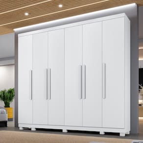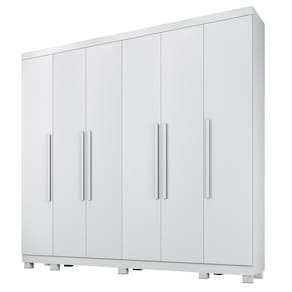 Guarda Roupa Miami 6 Portas 6 Gavetas 12 Prateleiras - Bene Branco O Guarda-Roupa Miami e produzido em chapa de 15 mm que garante robustez e maior vida util, com design moderno contem portas laterais independente. Conta com 6 portas, 12 prateleiras, 6 gavetas com corredicas telescopica e puxadores internos em pvc, cabideiro em aluminio, espaco para longos, pes inclusos no produto e puxadores amadeirados, otimo custo-beneficio. Sua fabricacao utiliza a linha mdp perffect, que une a sustentabilidade a inovacao tecnologica, proporcionando durabilidade e facil limpeza; inspirando sofisticacao ao mobiliario. Sua pintura uv conta com boa resistencia, e facil de limpar e e ecologicamente correto, pois utiliza madeira de reflorestamento, evitando o desmatamento. Caracteristicas: Material principal: MDP Espessura da chapa: 15 mm Escala de brilho: semibrilho Sistema de montagem: parafuso, cavilha e cantoneiras metalicas Quantidade de Portas: 06 Quantidade de Gavetas: 06 Quantidade de Prateleiras: 12