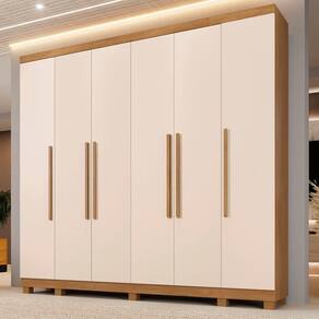 Guarda Roupa Miami 6 Portas 6 Gavetas 12 Prateleiras - Bene Cinamomo Off O Guarda-Roupa Miami e produzido em chapa de 15 mm que garante robustez e maior vida util, com design moderno contem portas laterais independente. Conta com 6 portas, 12 prateleiras, 6 gavetas com corredicas telescopica e puxadores internos em pvc, cabideiro em aluminio, espaco para longos, pes inclusos no produto e puxadores amadeirados, otimo custo-beneficio. Sua fabricacao utiliza a linha mdp perffect, que une a sustentabilidade a inovacao tecnologica, proporcionando durabilidade e facil limpeza; inspirando sofisticacao ao mobiliario. Sua pintura uv conta com boa resistencia, e facil de limpar e e ecologicamente correto, pois utiliza madeira de reflorestamento, evitando o desmatamento. Caracteristicas: Material principal: MDP Espessura da chapa: 15 mm Escala de brilho: semibrilho Sistema de montagem: parafuso, cavilha e cantoneiras metalicas Quantidade de Portas: 06 Quantidade de Gavetas: 06 Quantidade de Prateleiras: 12