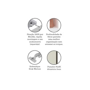O Guarda Roupa Modulado Prime foi desenvolvido se adequando a vários espaços, de grandes a pequenos. Possui 236 cm de altura oferece divisórias para atender diversas necessidades, profundidade de 56cm possibilitando acomodar roupas sem amassar. Produzido em MDP de 15mm, dobradiças Slowmotin reforçadas em 35mm, a montagem é inteira por minifix que proporciona um acabamento impecável e fundos embutidos com perfil usinado para melhor acabamento e maior resistência.