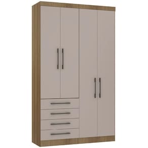 Caracteristicas: Estrutura: 100 MDP Acabamento: PF Quantidade de Portas: 4 Tipo de Dobradicas: Metalica Reforcada Quantidade de Gavetas: 4 Tipo de Corredicas: Telescopica Tipo de Cabideiros: 2 em Aluminio Tipo de Puxador: Plastico PS Champagne Tipo de Pes: Rodape Sistema de Montagem: Cavilhas, Parafs e Minifix Itens Incls: 1 Guarda Roupa, Kit ferragens e Manual de Montagem. Garantia: 3 meses