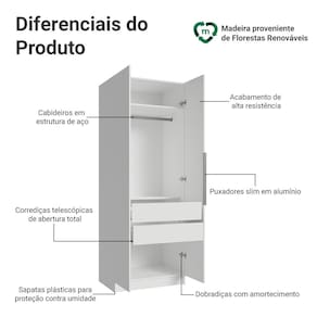Os diferenciais da linha Neo garantem conforto e durabilidade no dia a dia: ferragens de alta qualidade, como dobradiças com amortecimento, gavetas com corrediças de abertura total, cabideiros metálicos e puxadores slim em alumínio que completam o design sofisticado. O acabamento branco de alta resistência facilita a combinação com diferentes estilos de decoração.