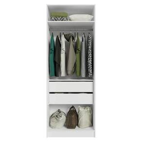 Com duas portas, duas gavetas espaçosas e um cabideiro interno, o módulo é ideal para organizar roupas maiores em cabides e acomodar peças dobradas ou acessórios nas gavetas.