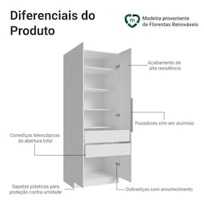 Os diferenciais da linha Neo garantem conforto e durabilidade no dia a dia: ferragens de alta qualidade, como dobradiças com amortecimento, gavetas com corrediças de abertura total e puxadores slim em alumínio que completam o design sofisticado. O acabamento branco de alta resistência facilita a combinação com diferentes estilos de decoração.