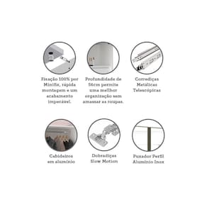 O Guarda Roupa Modulado Prime foi desenvolvido se adequando a vários espaços, de grandes a pequenos. Possui 236 cm de altura oferece divisórias para atender diversas necessidades, profundidade de 56cm possibilitando acomodar roupas sem amassar. Produzido em MDP de 15mm, dobradiças Slowmotin reforçadas em 35mm, gavetas com corrediças telescópicas, a montagem é inteira por minifix que proporciona um acabamento impecável e fundos embutidos com perfil usinado para melhor acabamento e maior resistência.