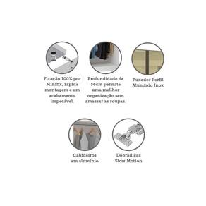 O Guarda Roupa Modulado Prime foi desenvolvido se adequando a vários espaços, de grandes a pequenos. Possui 236 cm de altura oferece divisórias para atender diversas necessidades, profundidade de 56cm possibilitando acomodar roupas sem amassar. Produzido em MDP de 15mm, dobradiças Slowmotin reforçadas em 35mm, a montagem é inteira por minifix que proporciona um acabamento impecável e fundos embutidos com perfil usinado para melhor acabamento e maior resistência.