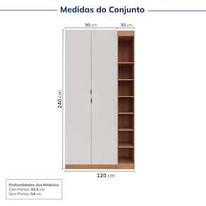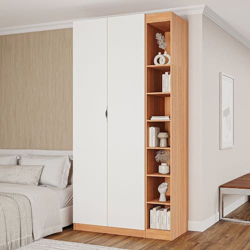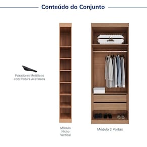 O Guarda Roupa Modulado 2 Portas 3 peças Cabeceira Hera CabeCasa foi desenvolvido para trazer a experiência de ter seu móvel customizado de acordo com a necessidade do seu espaço. O conjunto conta com um Guarda Roupas 02 Portas e um Nicho Vertical. Com essa proposta, CabeCasa oferece para seus clientes a possibilidade prática e custo-benefício em oferecer uma linha de modulados que faça a função de um móvel planejado. O cliente pode escolher entre os módulos disponíveis, em diferentes variações de acabamentos, os que mais se adaptam ao seu gosto e ao seu dia a dia. Além disso, conta com design moderno que irá trazer muito mais sofisticação e aconchego para a decoração.! Acabamento da Prateleira: Finish Foil Escala de Brilho da Prateleira: Semi-Fosco Possui Cabideiros: 01 Acabamento da Gaveta: Finish Foil Escala de Brilho da Gaveta: Semi-Fosco Possui Organizador de Gaveta: Não Acabamento da Porta: Pintura Escala de Brilho da Porta: Semi-Fosco Material do Puxador da Porta: Metal Altura dos Pés: 11 cm Altura Máxima dos Pés: 11.0000 Ambiente Principal: Quarto codigo_ean: 7909903827703 Complexidade da Montagem: Alta: deve ser montado por um montador especializado Cor: Louro/Branco Geada/Preto Cor do Produto: Louro/Branco Geada/Preto Cor Interna: Louro Escala de Brilho: Semi-Fosco Gaveta com Chave: Não Itens Inclusos: 01 Guarda Roupa 2 Portas, 01 Nicho Vertical, Kit Ferragens e Manual de Montagem Linha ou Coleção: Hera Manual de Montagem e Instalação: https://product-hub-prd.madeiramadeira.com.br/925552/documents/edabc9c4-a98b-4416-a9c1-2bb6cd24ec04216612648901721768264535.pdf Material da Gaveta: MDP Material da Porta: MDP Material da Prateleira: MDP Material dos Pés: MDP Material Principal: MDP Medida de Cada Item: Guarda Roupa 2 Portas: 90cm x 55,5cm x 240cm. Nicho Vertical: 30cm x 55,5cm x 240cm. modular: Sim Montagem Flex: Por ser modulado pode ser montado de acordo com a preferência do cliente. Necessita Montagem: Sim O Módulo Pode ser utilizado individualmente: Sim Origem do Produto: Nacional Peso: 149,782 kg Peso Máximo por Gaveta: 5 kg Peso Máximo por Prateleira: 10 kg Possui Calceiros: Não Possui Espelho: Não Possui Pés: Rodapé Possui Portas: Sim Possui Prateleiras: Sim Produto Montado: Sim Quantidade de Gavetas: 02 Gavetas Quantidade de Prateleiras: 06 Prateleiras Recomendações de Uso, Manutenção e Limpeza: Deve ser realizada com pano limpo e seco. Sistema de Montagem: Cavilha, Parafuso e Minifix. Tipo de Corrediça da Gaveta: Metálica Telescópica Tipo de Dobradiça/Corrediça da Porta: Metálica Tipo de Gaveta: Interna Tipo de Guarda-Roupa: Modulado Casal Tipo de Puxador da Gaveta: Não Possui Tipo de Puxador da Porta: Externo