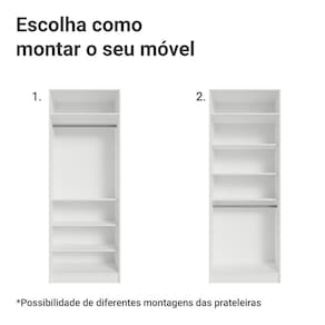 Com quatro prateleiras internas e um cabideiro, oferece espaço versátil para roupas dobradas, acessórios e peças maiores em cabides.