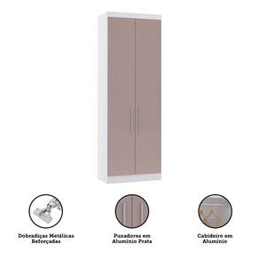 Caracteristicas: Estrutura: 100 MDP Acabamento: PF Quantidade de Portas: 2 Tipo de Dobradicas: Metalica Reforcada Tipo de Cabideiros: 2 em Aluminio Tipo de Puxador: Aluminio Prata Tipo de Pes: Rodape Sistema de Montagem: Cavilhas, Parafusos e Minifix Itens Inclusos: 1 Guarda Roupa, Kit ferragens e Manual de Montagem. Garantia: 3 meses