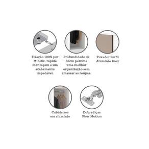 O Guarda Roupa Modulado Prime foi desenvolvido se adequando a vários espaços, de grandes a pequenos. Possui 236 cm de altura oferece divisórias para atender diversas necessidades, profundidade de 56cm possibilitando acomodar roupas sem amassar. Produzido em MDP de 15mm, dobradiças Slowmotin reforçadas em 35mm, a montagem é inteira por minifix que proporciona um acabamento impecável e fundos embutidos com perfil usinado para melhor acabamento e maior resistência.