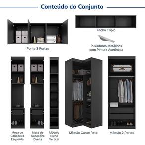 O Guarda Roupa Modulado 11 portas 7 peças Cabeceira Hera CabeCasa foi desenvolvido para trazer a experiência de ter seu móvel customizado de acordo com a necessidade do seu espaço. O conjunto conta com dois módulos de Mesa de Cabeceira, uma Ponte 3 Portas, um Nicho Triplo, um Guarda Roupa de Canto Reto, um Guarda Roupa 2 Portas e um Nicho Vertical. Com essa proposta, CabeCasa oferece para seus clientes a possibilidade prática e custo-benefício em oferecer uma linha de modulados que faça a função de um móvel planejado. O cliente pode escolher entre os módulos disponíveis, em diferentes variações de acabamentos, os que mais se adaptam ao seu gosto e ao seu dia a dia. Além disso, conta com design moderno que irá trazer muito mais sofisticação e aconchego para a decoração.! Acabamento da Prateleira: Pintura Escala de Brilho da Prateleira: Semi-Fosco Possui Cabideiros: Sim Acabamento da Gaveta: Pintura Escala de Brilho da Gaveta: Semi-Fosco Possui Organizador de Gaveta: Não Acabamento da Porta: Pintura Escala de Brilho da Porta: Semi-Fosco Material do Puxador da Porta: Metal Altura dos Pés: 11 Altura Máxima dos Pés: 11.0000 Ambiente Principal: Quarto codigo_ean: 7909903825129 Complexidade da Montagem: Alta: deve ser montado por um montador especializado Cor: Preto/Cinza Cor do Produto: Preto/Cinza Cor Interna: Preto Escala de Brilho: Semi-Fosco Gaveta com Chave: Não Itens Inclusos: 02 Módulos de Mesa de Cabeceira, 01 Ponte 3 Portas, 01 Nicho Triplo, 01 Guarda Roupa de Canto Reto, 01 Guarda Roupa 2 Portas e 01 Nicho Vertical Linha ou Coleção: Hera Manual de Montagem e Instalação: https://product-hub-prd.madeiramadeira.com.br/925495/documents/ac4930ab-837b-420a-ad68-bbceb8e389352164037489017217601285517.pdf Material da Gaveta: MDP Material da Porta: MDP Material da Prateleira: MDP Material dos Pés: MDP Material Principal: MDP Medida de Cada Item: Guarda Roupa 2 Portas: 90cm x 54cm x 240cm. Ponte 3 Portas: 165cm x 54cm x 68cm. Nicho Triplo: 165cm x 40cm x 34cm. Canto Reto: 110cm x 99,5cm x 240cm. Módulo Mesa de Cabeceira: 45cm x 54cm x 240cm. Nicho Vertical: 30cm x 54cm x 240cm. modular: Sim Montagem Flex: Por ser modulado pode ser montado de acordo com a preferência do cliente. Necessita Montagem: Sim O Módulo Pode ser utilizado individualmente: Sim Origem do Produto: Nacional Peso: 512,85 kg Peso Máximo por Gaveta: 5 kg Peso Máximo por Prateleira: 10 kg Possui Calceiros: Não Possui Espelho: Não Possui Pés: Rodapé Possui Portas: Sim Possui Prateleiras: Sim Produto Montado: Sim Quantidade de Gavetas: 06 Gavetas Quantidade de Prateleiras: 11 Prateleiras Recomendações de Uso, Manutenção e Limpeza: Deve ser realizada com pano limpo e seco. Sistema de Montagem: Cavilha, Parafuso e Minifix. Tipo de Corrediça da Gaveta: Metálica Telescópica Tipo de Dobradiça/Corrediça da Porta: Metálica Tipo de Gaveta: Interna Tipo de Guarda-Roupa: Modulado Casal Tipo de Puxador da Gaveta: Não Possui Tipo de Puxador da Porta: Externo