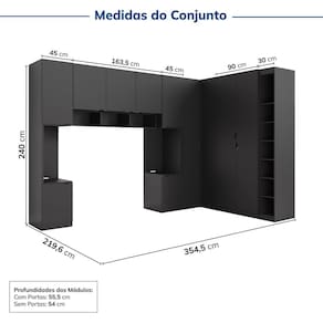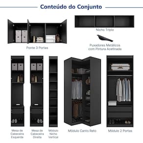 Guarda-roupa Modulado de Canto 11 Portas 7 Peças Hera Cabecasa Madeiramadeira Preto. O Guarda Roupa Modulado 11 portas 7 peças Cabeceira Hera CabeCasa foi desenvolvido para trazer a experiência de ter seu móvel customizado de acordo com a necessidade do seu espaço. O conjunto conta com dois módulos de Mesa de Cabeceira, uma Ponte 3 Portas, um Nicho Triplo, um Guarda Roupa de Canto Reto, um Guarda Roupa 2 Portas e um Nicho Vertical. Com essa proposta, CabeCasa oferece para seus clientes a possibilidade prática e custo-benefício em oferecer uma linha de modulados que faça a função de um móvel planejado. O cliente pode escolher entre os módulos disponíveis, em diferentes variações de acabamentos, os que mais se adaptam ao seu gosto e ao seu dia a dia. Além disso, conta com design moderno que irá trazer muito mais sofisticação e aconchego para a decoração.!