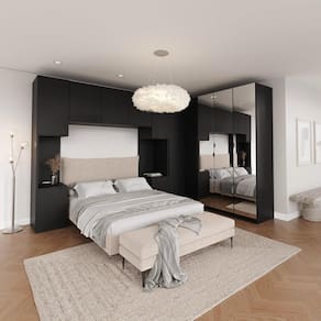 Guarda Roupa Modulado de Casal com Espelho 12 Portas 6 Peças e 2 Mesas de Cabeceira Hera CabeCasa MadeiraMadeira Preto. O Guarda Roupa Modulado de Canto 9 portas e 3 portas com espelho 6 peças com duas Mesas de Cabeceira Hera CabeCasa foi desenvolvido para trazer a experiência de ter seu móvel customizado de acordo com a necessidade do seu espaço. O conjunto conta com módulo de uma e duas portas com espelho, canto reto, duas mesas de cabeceira e ponte 3 portas. Com essa proposta, CabeCasa oferece para seus clientes a possibilidade prática e custo-benefício em oferecer uma linha de modulados que faça a função de um móvel planejado. O cliente pode escolher entre os módulos disponíveis, em diferentes variações de acabamentos, os que mais se adaptam ao seu gosto e ao seu dia a dia. Além disso, conta com design moderno que irá trazer muito mais sofisticação e aconchego para a decoração. Montagem Flex: As prateleiras podem ser removíveis com diferentes opções de altura, os cabideiros podem ser removíveis e possuem opções para serem utilizado como calceiro ou como cabideiro. Já os gaveteiros possuem duas posições de altura para instalação nos módulos de