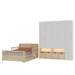 Os guarda-roupas modulados completam o espaço com inteligência, trazendo gavetas telescópicas, nichos iluminados e caixas organizadoras que estimulam a autonomia. A base em madeira natural de pinus, aliada ao branco e ao toque artesanal, cria um refúgio sereno que nutre o desenvolvimento cognitivo. É a combinação perfeita de funcionalidade e inspiração para o crescimento integral.