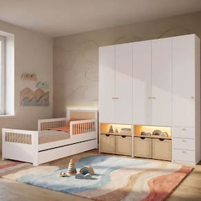 A funcionalidade se destaca na organização inteligente dos guarda-roupas modulados, que contam com gavetas de corrediças telescópicas, prateleiras versáteis e nichos iluminados por LED, criando um cenário mágico para a leitura e o descanso. Detalhes orgânicos em rattan e puxadores em pinus convidam ao toque, enquanto as dobradiças com amortecimento asseguram um manuseio suave e silencioso. Este conjunto não apenas organiza o dormitório com sofisticação, mas transforma o quarto em um refúgio educativo onde a estética escandinava e a pedagogia caminham juntas. É a escolha ideal para famílias que buscam um móvel durável, capaz de nuerir o desenvolvimento cognitivo e emocional em um ambiente minimalista, acolhedor e repleto de personalidade.