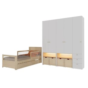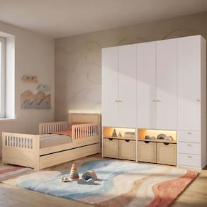 A funcionalidade se destaca na organização inteligente dos guarda-roupas modulados, que contam com gavetas de corrediças telescópicas, prateleiras versáteis e nichos iluminados por LED, criando um cenário mágico para a leitura e o descanso. Detalhes orgânicos em rattan e puxadores em pinus convidam ao toque, enquanto as dobradiças com amortecimento asseguram um manuseio suave e silencioso. Este conjunto não apenas organiza o dormitório com sofisticação, mas transforma o quarto em um refúgio educativo onde a estética escandinava e a pedagogia caminham juntas. É a escolha ideal para famílias que buscam um móvel durável, capaz de nuerir o desenvolvimento cognitivo e emocional em um ambiente minimalista, acolhedor e repleto de personalidade.