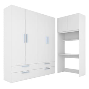 Detalhes Técnicos: Medidas do Produto Montado: A:220cm x L:160cm x L:80cm x P:47cm Medida do Módulo 2pts 2gav:A:220cm x L:80cm x P:47cm Medida do Módulo 2pts: A:220cm x L:80cm x P:47cm Medida da Escrivaninha: A:74cm x L:80cm x P:47cm MDP 15/25mm Acabamento: Pintura UV Tonalidade: Branco/Azul Puxadores: MDF 18mm Cabideiro interno: Alumínio Gaveta: corrediça metálica Prateleiras suporta até 5kg distribuído Gavetas suporta até 3kg distribuído
