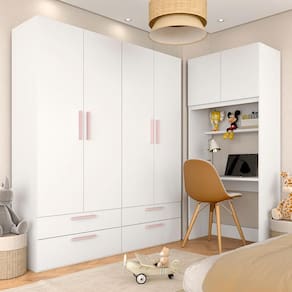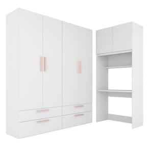Detalhes Técnicos: Medidas do Produto Montado: A:220cm x L:160cm x L:80cm x P:47cm Medida do Módulo 2pts 2gav:A:220cm x L:80cm x P:47cm Medida do Módulo 2pts: A:220cm x L:80cm x P:47cm Medida da Escrivaninha: A:74cm x L:80cm x P:47cm MDP 15/25mm Acabamento: Pintura UV Tonalidade: Branco/Rosa Puxadores: MDF 18mm Cabideiro interno: Alumínio Gaveta: corrediça metálica Prateleiras suporta até 5kg distribuído Gavetas suporta até 3kg distribuído