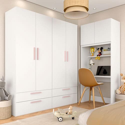 Guarda Roupa Modulado Infantil Joy com Escrivaninha, ideal para você deixar tudo organizado. Um Modulado infantil inteligente, com espaço para os estudos. Com puxadores revestidos em MDF e pintura P.U traz sofisticação e charme.