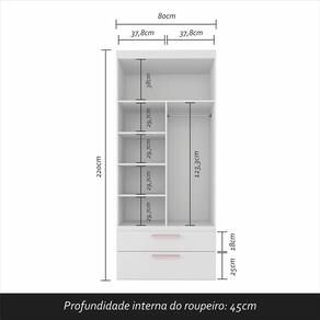 Detalhes Técnicos Medidas do Produto Montado: A: 220cm x L: 160cm x P: 47cm - MDP 15mm e 25mm - Acabamento em Pintura UV - Tonalidade: Branco/Rosa/Linho Bege - Puxadores: MDF 18mm - Cabideiro interno: Alumínio -Cabideiro Externo: Metalon em pintura Epóx preto - Gavetas com Corrediças Metálicas - Prateleiras suportam até 5kg distribuídos - Gavetas suportam até 3kg distribuídos - Puff Baú suporta até 80kg distribuídos - Assento do Puff removível no tecido Linho Bege
