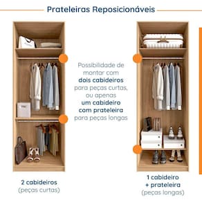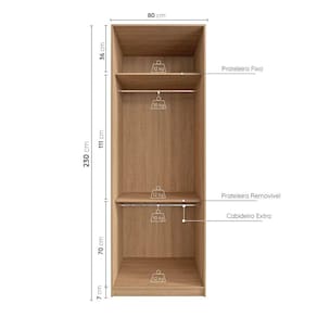 O guarda roupas modular Joy CabeCasa foi desenvolvido para trazer a experiência de ter seu guarda roupas planejado e organizado por uma personal organizer acessível ao cliente MadeiraMadeira. O módulo Cabideiro foi desenvolvido para ser versátil e adaptável a sua rotina. Ele foi pensado para a melhor organização e disposição das roupas, possui opção de ser montado com apenas um cabideiro para peças longas ou dois cabideiros para peças curtas, além disso possui prateleiras removíveis e com regulagem de altura, sendo uma ótima opção para quem prefere pendurar as roupas. Para auxiliar e deixar a organização mais fácil no dia a dia, o produto ainda conta com um kit de separadores de cabides e uma cartela de adesivos para identificar os espaços. Desta forma você pode categorizar e separar melhor a suas roupas mantendo a organização por mais tempo. O modulado possui ainda puxadores em madeira maciça envernizados na cor preta, portas com dobradiças “soft closing” e cabides em aço cromado. Além disso, conta com design atual e alinhado às tendências, conferindo mais sofisticação a sua decoração sem deixar de lado a praticidade! Acabamento da Prateleira: Finish Foil Escala de Brilho da Prateleira: Semi-Fosco Possui Cabideiros: 02 Acabamento da Porta: Finish Foil Escala de Brilho da Porta: Semi-Brilho Material do Puxador da Porta: Madeira Maciça Acabamento dos Pés: Finish Foil Altura dos Pés: 7 cm Ambiente Principal: Quarto Complexidade da Montagem: Alta: deve ser montado por um montador especializado Cor: Cinza Sereno/Avena Cor do Produto: Cinza Sereno/Avena Cor Flex: Não Cor Interna: Avena Escala de Brilho: Semi-Brilho Informações Complementares: Portas com dobradiças com amortecimento e cabideiro em aço cromado. Embalagens 100% recicláveis. Prateleiras 12kg/ Cabideiros 10kg Itens Inclusos: 1 Módulo Cabideiro, kit organizer, kit de ferragens e manual de montagem Linha ou Coleção: Joy Manual de Montagem e Instalação: https://cdn2.madeiramadeira.com.br/atributo/tom-da-cor/1168861-manualdemontagem-modulo800-cabideiro-v-01.pdf Material da Porta: MDP Material da Prateleira: MDP Material dos Pés: MDP Material Principal: MDP Necessita Montagem: Sim Origem do Produto: Nacional Peso: 79,5 kg Peso Máximo por Prateleira: 12 kg Possui Calceiros: Não Possui Espelho: Não Possui Pés: Rodapé Possui Portas: 02 Possui Prateleiras: 02 Recomendações de Uso, Manutenção e Limpeza: Retire o pó com flanela seca. Sapatas Niveladoras: Não Sistema de Montagem: Parafuso e Cavilha Tipo de Dobradiça/Corrediça da Porta: Metálica Tipo de Guarda-Roupa: Modulado Casal Tipo de Puxador da Porta: Externo