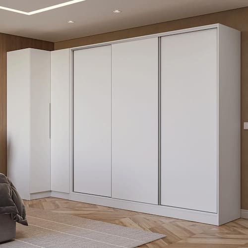O Guarda-Roupa Royale, por sua vez, é fabricado em 100% em MDF, conta com três portas de correr. Seu interior é amplo e bem distribuído, com prateleiras, nichos, três cabideiros e quatro gavetas espaçosas, oferecendo capacidade para roupas, acessórios e muito mais.