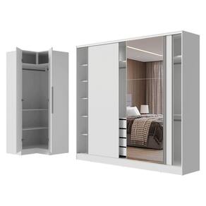 O Guarda-Roupa Royale, por sua vez, é fabricado em 100% em MDF, conta com três portas de correr, sendo uma com espelho que amplia o ambiente e otimiza o espaço. Seu interior é amplo e bem distribuído, com prateleiras, nichos, três cabideiros e quatro gavetas espaçosas, oferecendo capacidade para roupas, acessórios e muito mais.