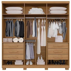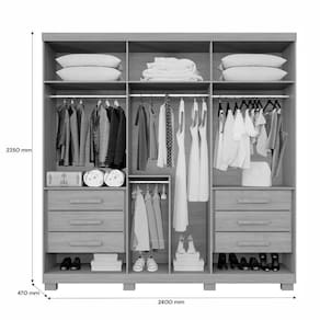 Materiais e Estrutura: Produzido em 100 MDP de 15 mm, garantindo maior vida util 6 portas 6 prateleiras Espaco para roupas longas Moldura frisada com toque moderno 6 gavetas espacosas com corredicas telescopicas e puxadores internos Cabideiro em aluminio Pes inclusos