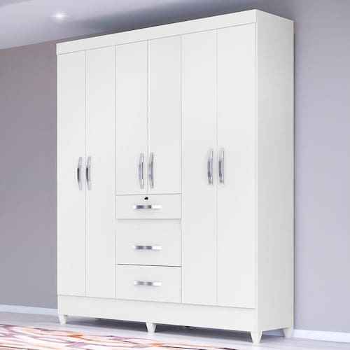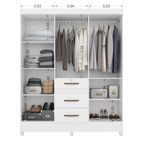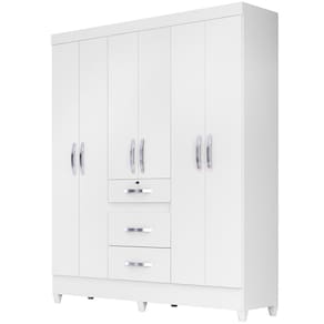 Conta com 6 Portas de bater, 3 gavetas externas com corrediças metálicas, sendo 1 delas com chave. Oferece um amplo espaço interno que comporta peças em cabides e dobradas, outros objetos, lençóis e até calçados.
