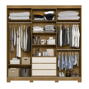 Deixe seu quarto organizado com o Guarda-Roupa Moval Napoles. Ele se destaca pelo design imponente com 3 portas que protegem um espaço interno composto por 4 gavetas, maleiros, nichos, prateleiras e cabideiros. Todos esses compartimentos permitirão que você guarde roupas e pertences de forma funcional e organizada.